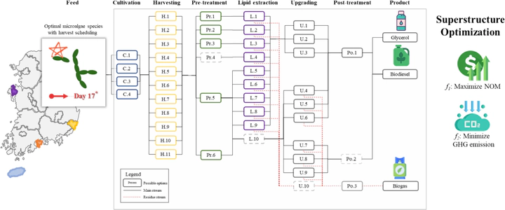 Prof. SungKu Heo published a research paper on optimal microalgae-based biorefinery design under time-varying climatic conditions. This study proposes an integrated framework that combines kinetic growth modeling, harvest scheduling optimization, and multi-objective superstructure optimization to enhance both economic and environmental performance of microalgae biorefineries. By incorporating temperature and solar radiation data, the research identifies optimal harvest intervals using a genetic algorithm and determines the best process pathways balancing profitability and carbon emissions. The results demonstrate that Asterionella formosa achieves the highest biomass productivity, while the optimized system improves net operational margin and significantly reduces CO₂ emissions. The findings highlight the potential of climate-adaptive, optimization-driven strategies for sustainable large-scale biofuel production. The paper is accessible via the following DOI link: https://doi.org/10.1016/j.enconman.2025.120247.