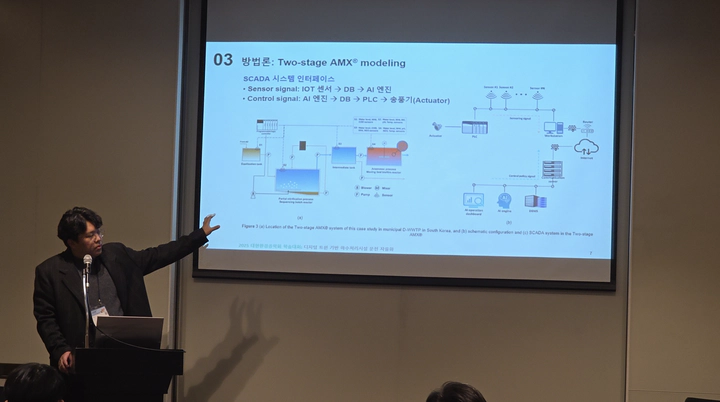 Prof. SungKu Heo presented “Autonomous operation of wastewater treatment plants based on digital twins: Trustworthy AI-driven optimal control and real-world validation” at the conference of the Korean Society of Environmental Engineers (KSEE). The presentation focused on the development of a digital twin framework integrated with trustworthy AI for autonomous process control, with emphasis on enhancing operational reliability, optimal performance, and practical implementation in full-scale wastewater treatment system.